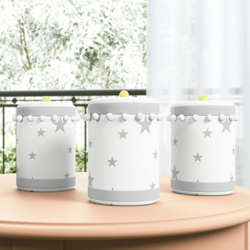 O Jogo de Potes Estrelinhas e Pompons Cinza é ideal para guardar algodão, cotonetes, gaze e outros objetos de pequeno porte. O conjunto é confeccionado em plástico e tecido, com detalhes da estampa de estrelas e aplicações de mini pompons.