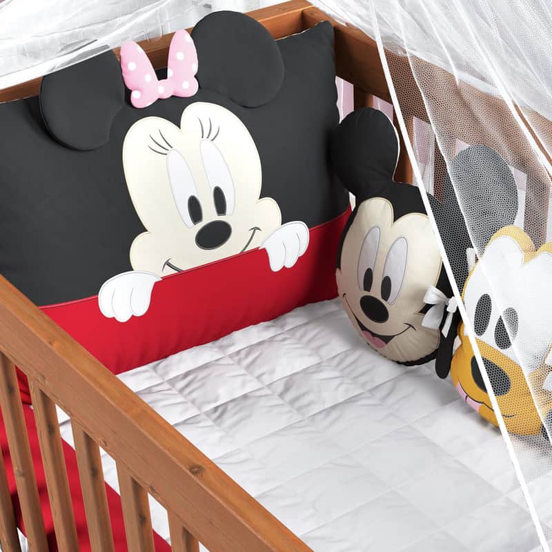 As almofadinhas protetoras com bordados oficiais Disney dos personagens Mickey Mouse, Pluto, Margarida, Minnie Mouse e Pateta são o destaque desse conjunto. A cabeceira possui aplicações em 3D, transformando esse Kit Berço no enxoval dos sonhos!
