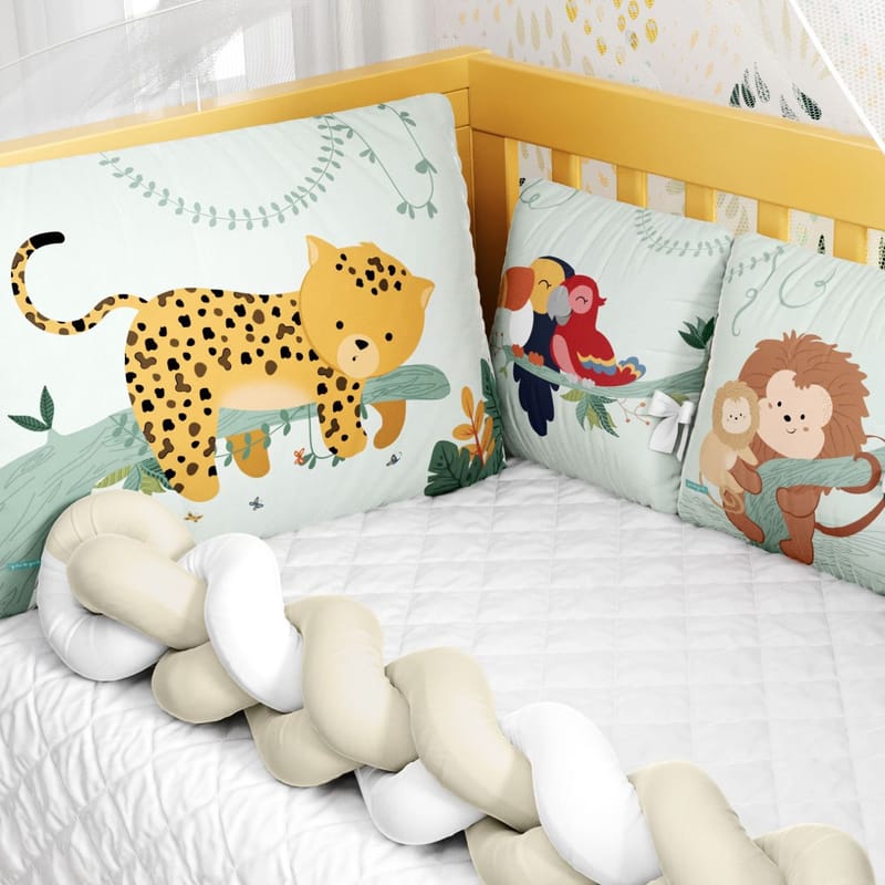 Essa novidade da Grão de Gente é composta por quatro almofadas Amiguinhos que servem como protetores laterais e já vêm com fitas para fixação no berço e entre si: uma oncinha-pintada, um guaxinim, uma arara, um tucano, um lobo-guará e uma mamãe e seu filhote mico leão dourado estampam esse enxoval com tons da natureza.