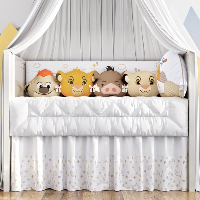 Esse conjunto é composto por uma cabeceira, dois rolinhos estampados e quatro fofíssimas almofadas protetoras: Simba, Nala, Timão e Pumba, que acompanham o crescimento do bebê e podem ser usadas na cama infantil e depois na cama de solteiro.