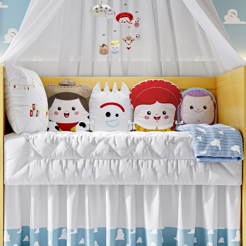 • Almofadas protetoras com bordados e formas dos personagens: Garfinho, Woody, Buzz Lightyear e Jessie