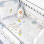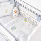 O Kit Berço Astronauta Patchwork Azul conta com edredom e protetores de berço estampados que acompanham uma cabeceira e duas laterais com enchimento fofinho, zíper e laços para fixação no berço de bebê; jogo de lençol 100% algodão com lençol de cima e de baixo com elástico e fronha, mosquiteiro com varal de tule e bandô decorativo bordado. O edredom é tão aconchegante e macio que aquece mesmo nos dias mais frios, enquanto o jogo de lençol será ótimo para os dias quentes. Os protetores de berço são responsáveis pela segurança do bebê, que estará protegido de se machucar e prender os bracinhos na grade do móvel. Não é recomendado pelos médicos o uso de repelente até o seis meses de vida, por isso o Mosquiteiro Patchwork será essencial para proteger o recém-nascido das picadas de mosquitos e pernilongos, tudo sem comprometer a circulação do ar.