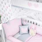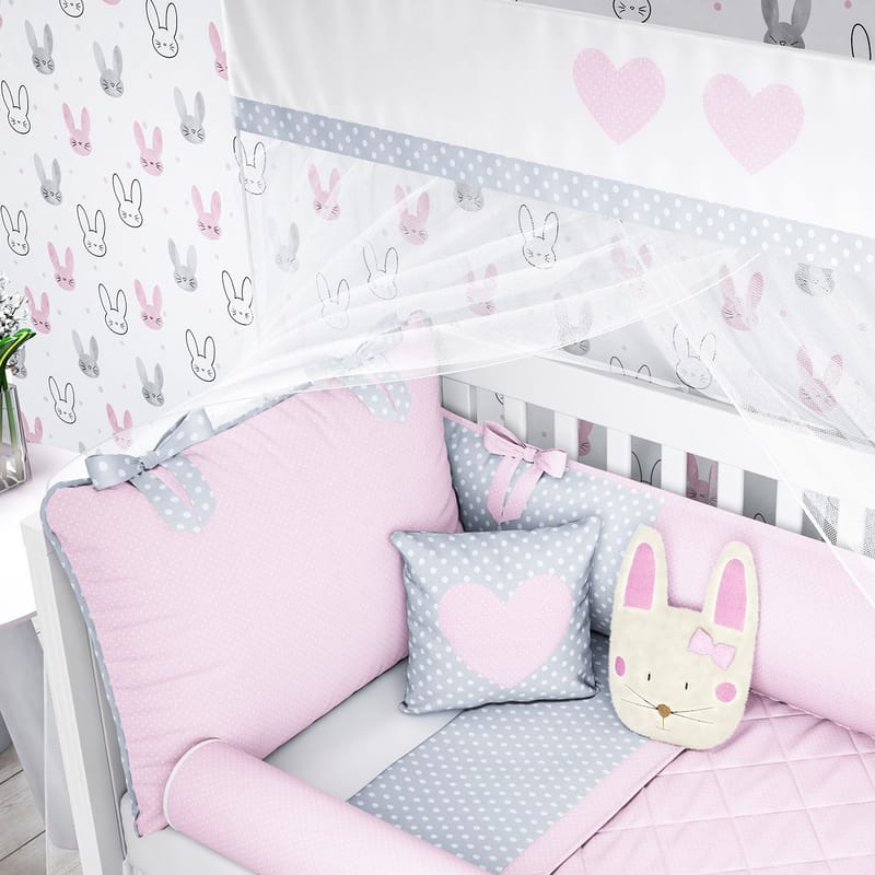 Harmônico, o Kit Berço Coelhinha é a escolha perfeita para receber a menina mais importante da sua vida! Esse enxoval foi desenhado com carinho e muita ternura, pronto para garantir o bem-estar da pequena e a mais linda decoração do quarto de bebê — o sonho de toda mamãe e papai. Indicadas para berço americano e nacional, as onze peças unem a delicadeza e o bom gosto da Grão de Gente, que transparecem na linda combinação entre laços, estampa poá, bordados de coração e a suave paleta de cores, composta por rosa e cinza. O tecido que entra em contato direto com a recém-nascida é 100% algodão e oferece o mais suave toque em sua pele, enquanto os enchimentos deixam os itens bem fofinhos.