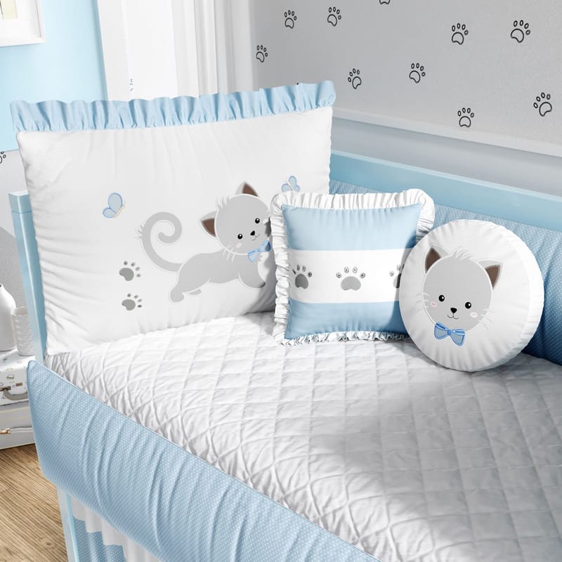 Leve a fofura do Kit Berço Menino Gatinho Azul para o quarto de bebê do seu menino. Esse enxoval exclusivo da Grão de Gente tem tudo o que você precisa para aconchegar e proteger seu príncipe com materiais de qualidade e enchimento fofinho. Os protetores laterais e a cabeceira vêm com zíper, para facilitar a lavagem, e amarril, para fixação no berço.
