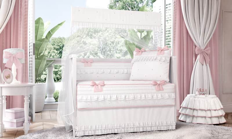 Inspirado nos cenários românticos dos contos de fadas, o Kit Berço Princesa Clássica traz ao quarto de bebê toques de tradição e sonho em forma de rendas, bordados, passa fitas, laços e babadinhos. Tons delicados de cor de rosa contrastam com a base branca de tecido 100% algodão das suas 9 peças. Você vai se apaixonar pelo conforto e a funcionalidade dos protetores laterais e da cabeceira com enchimento fofinho e zíper para facilitar a lavagem.