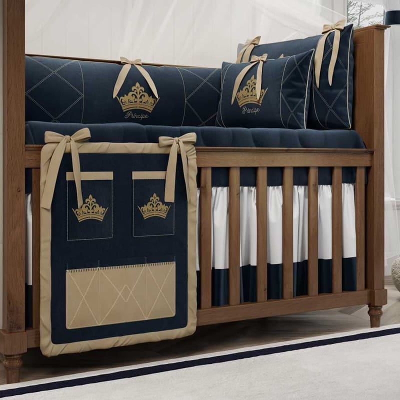 O enxoval perfeito para o menino mais lindo da família precisa ter o conforto, a elegância e a proteção do Kit Berço Príncipe Marinho Premium! Um conjunto completo com 9 peças confeccionadas com tecidos de ótima qualidade, jogo de lençol palha 100% algodão com três itens (de baixo com elástico, de cima e fronha) e maravilhosos bordados em forma de coroa, que vão transformar o quarto de bebê num ambiente digno de capa de revista!