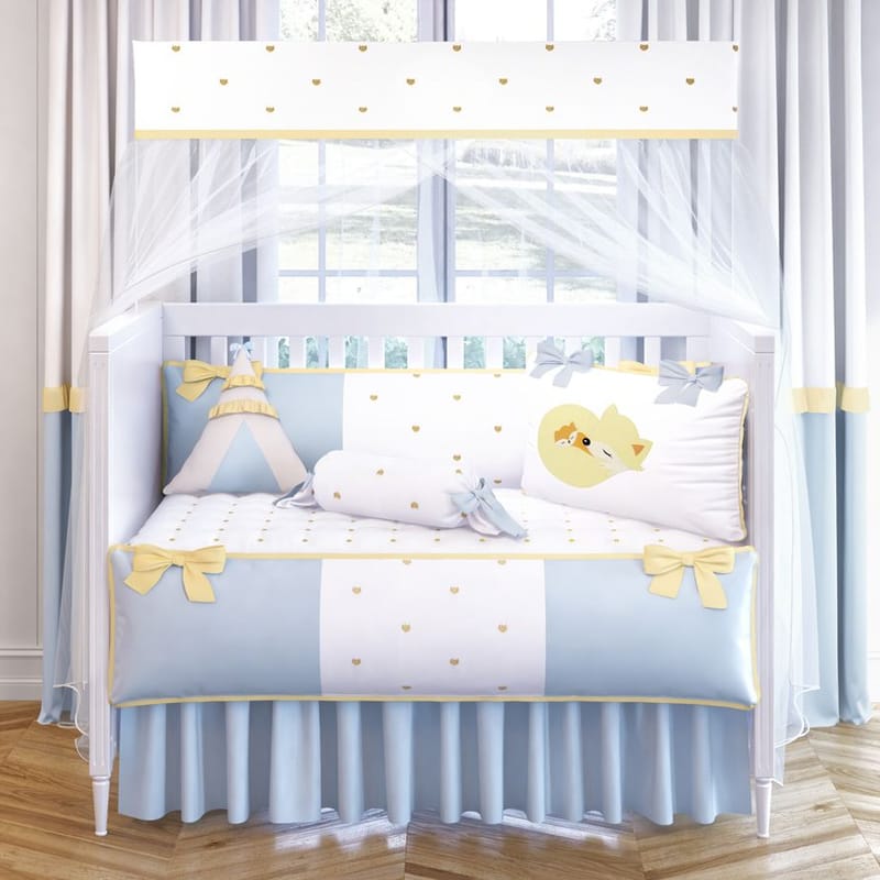 Nessa coleção unissex, os produtos ganharam bordados de raposinha e uma linda paleta de cores, que combina azul bebê, amarelo e branco - perfeito para compor uma moderna decoração do quarto de bebê.