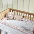 Com protetores em formato de rolinho e a beleza atemporal da estampa floral, o enxoval proporciona uma atmosfera romântica e repleta de aconchego no ambiente.