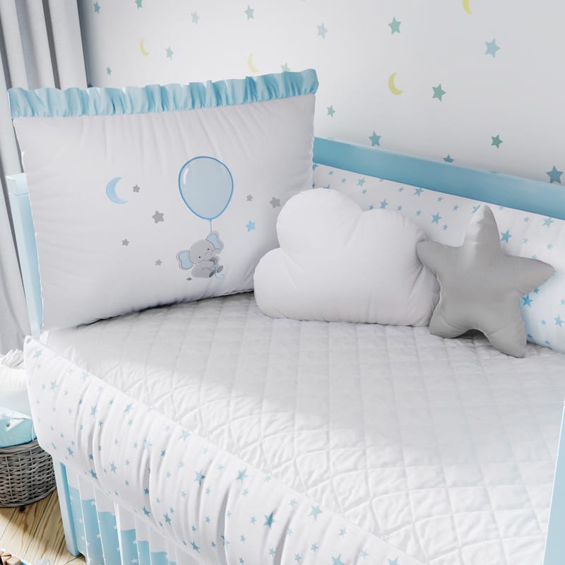 Esse simpático elefantinho vai encantar você! O Kit Berço Menino Sonhe Alto Elefantinho Azul é um produto exclusivo da Grão de Gente, maior marca da América Latina em enxoval e decoração para quarto de bebê. Um conjunto completo com tudo o que você precisa para aconchegar e proteger seu menino com materiais de qualidade e enchimento fofinho. Os protetores laterais e a cabeceira vêm com zíper, para facilitar a lavagem, e amarril, para fixação no berço.