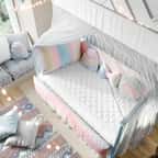 Esse enxoval criativo e aconchegante vai conquistar toda a família com seu colorido pastel, adicionando alegria ao ambiente. O conjunto completo cria um mood super original, com a cabeceira colorida e nuances rosadas que representam o amor universal e fraternal. Uma novidade apaixonante da Grão de Gente para criar o quarto dos seus sonhos!