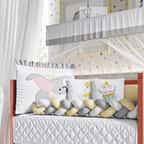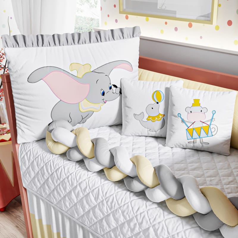 Só a Grão de Gente para trazer o mundo mágico da Disney para a decoração do quarto do seu bebê! O Kit Berço Trança Dumbo é um conjunto completo com 6 peças para aconchegar e proteger seu amor. Esse enxoval exclusivo, confeccionado com materiais de qualidade e enchimento fofinho, possui uma linda cabeceira com bordado do elefante Dumbo, já vêm com zíper, para facilitar a lavagem, e amarril, para fixação no berço. Indicado para berços com padrão americano ou nacional.