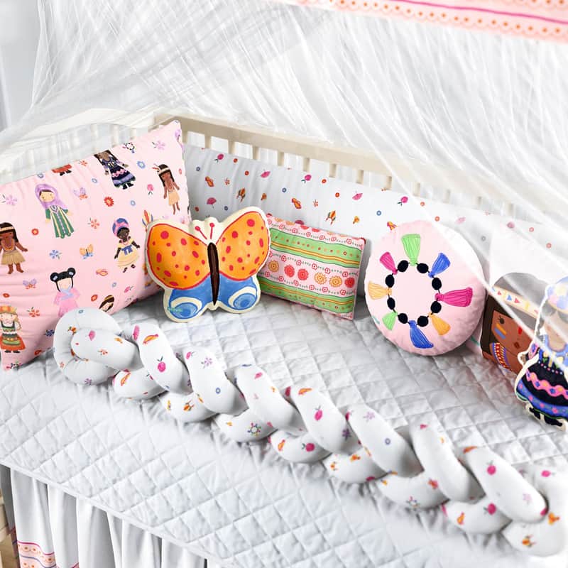 Lindo, colorido e diverso como o mundo é. Esse é o conceito do Kit Berço Trança Meninas do Mundo, uma decoração autêntica, inspirada na beleza da diversidade cultural, para inovar no quarto de bebê da sua pequena! Um enxoval lúdico com desenhos encantadores, como borboletas, flores, leques e cocares, além de ser exclusivo Grão de Gente, as estampas são de alta definição e confeccionadas com tinta atóxica (a base de água), toque delicado a pele do recém-nascido.
