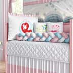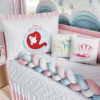 O Kit Berço Trança Princesa Ariel traz um toque do mundo mágico das Princesas da Disney para a decoração do quarto da sua menina! Uma exclusividade da Grão de Gente com 9 peças para aconchegar e proteger seu amor. Esse enxoval exclusivo, confeccionado com materiais de qualidade e enchimento fofinho, possui uma linda cabeceira com bordado de A Pequena Sereia, já vêm com zíper, para facilitar a lavagem, e amarril, para fixação no berço. Indicado para berços com padrão americano ou nacional.