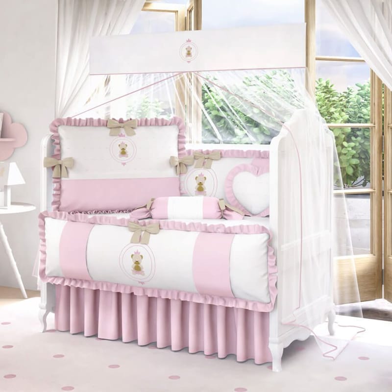 O macio edredom matelado aquece nos dias mais frios do ano, enquanto o jogo de lençol de três peças (com fronha, lençol de baixo com elástico e lençol de cima) evita o contato entre a neném e a superfície do colchão. Preocupado com a segurança da sua princesa, o Kit Berço Ursinha Realeza Rosa traz um lindo protetor de berço, com cabeceira e duas laterais, todas com zíper. Já que os pediatras não recomendam o uso de repelentes até o sexto mês, o mosquiteiro com bandô finamente decorado mantém os insetos afastados da pequena, garantindo uma noite tranquila.