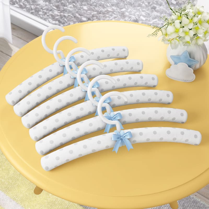 O Kit Cabides Salmão Poá contém seis peças para pendurar as roupas do bebê com muito capricho.