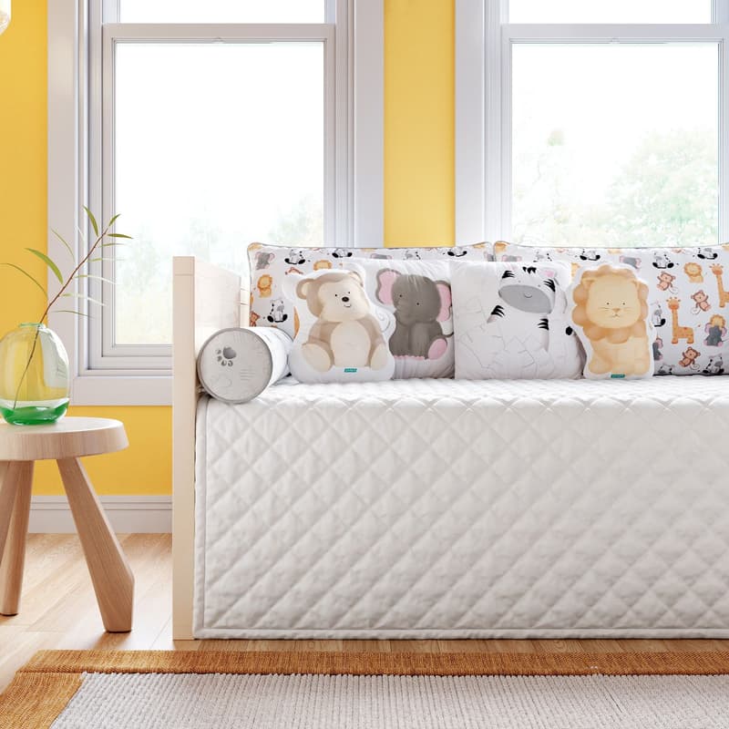 Criação exclusiva Grão de Gente, o Kit Cama Babá Safári Aquarela traz os personagens queridinhos da savana para completar a decoração do quarto de bebê e encantar toda a família!