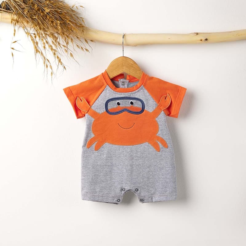 O macacãozinho também possui fechamento com botões de pressão na parte inferior, mangas curtas fresquinhas, bordado de siri divertido e encantador e um aplique de patinhas interativas para estimular sensorialmente o seu príncipe.
