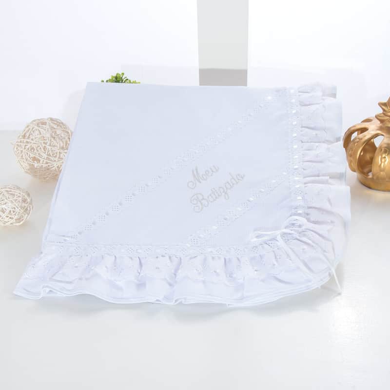 Manta Meu Batizado Branca 86cm da Bordados Regina: R$ 105,39 no PIX ou R$ 123,99 em até 12x sem juros. Frete grátis acima de R$499. Entrega rastreada com garantia de 7 dias para trocas.