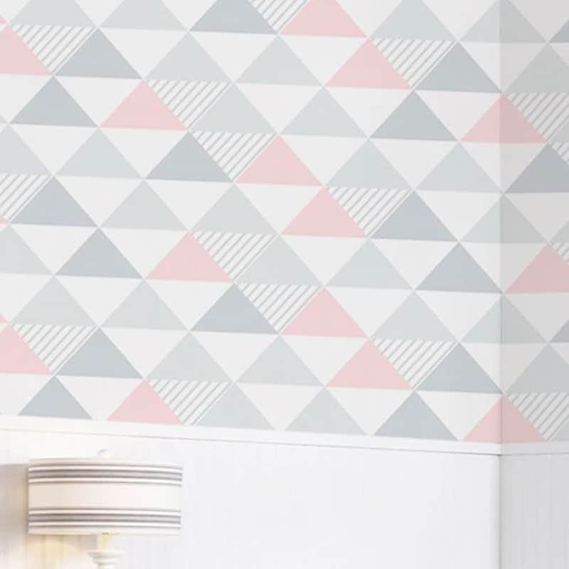 Papel de Parede Triângulos Rosa/Cinza 10m da Decorisi: R$ 318,74 no PIX ou R$ 374,99 em até 12x sem juros. Frete grátis acima de R$499. Entrega rastreada com garantia de 7 dias para trocas.