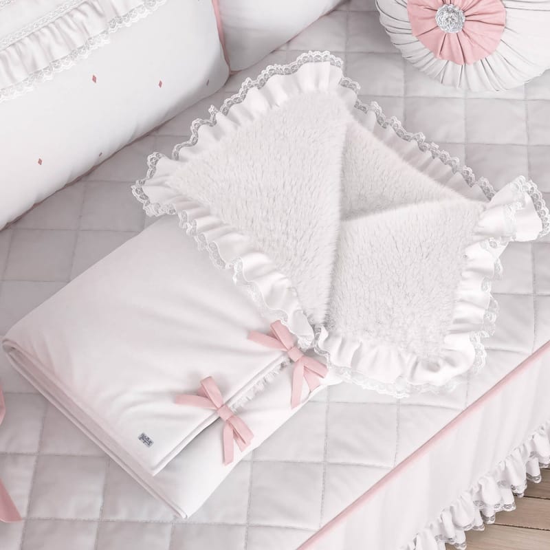 Pode ser utilizado durante uma viagem ou visita na casa da vovó e também como um saquinho de dormir. Seu design é confortável e delicado, com a cor rosa e branco, rendinhas e laços que são uma graça!
