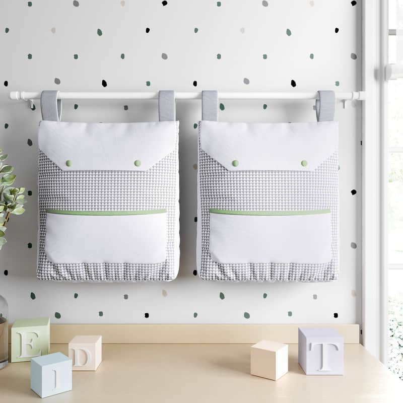 O porta fraldas é um organizador prático que mantém as fraldas sempre à mão para a hora da troca. Na Grão de Gente, os modelos incluem porta fraldas de parede, de cômoda e de berço, em tecido decorativo que combina com o tema do quartinho. Além de fraldas, os compartimentos acomodam pomadas, lenços umedecidos e outros itens de higiene, facilitando a rotina dos pais com praticidade e organização.