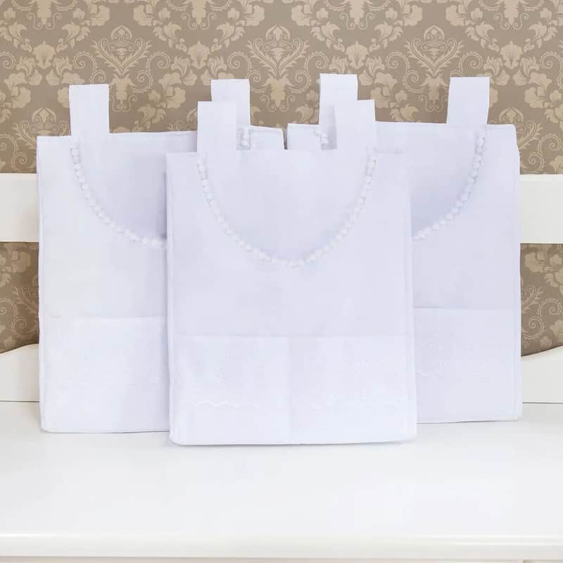 O porta fraldas é um organizador prático que mantém as fraldas sempre à mão para a hora da troca. Na Grão de Gente, os modelos incluem porta fraldas de parede, de cômoda e de berço, em tecido decorativo que combina com o tema do quartinho. Além de fraldas, os compartimentos acomodam pomadas, lenços umedecidos e outros itens de higiene, facilitando a rotina dos pais com praticidade e organização.