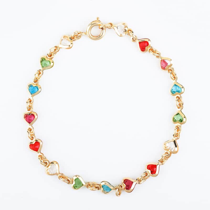 Pulseira Infantil Corações Coloridos com Strass Ouro da Grão de Gente: R$ 131,74 no PIX ou R$ 154,99 em ate 12x sem juros. Frete gratis acima de R$499. Entrega rastreada com garantia de 7 dias para trocas.