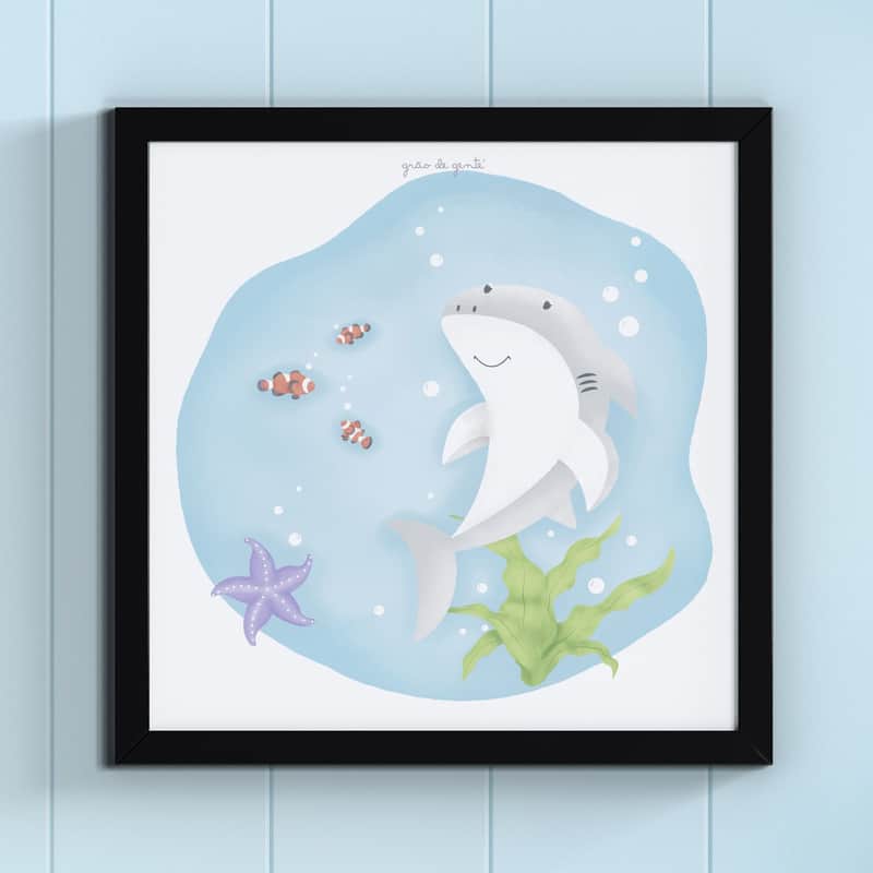 Quadro Fundo do Mar Pequeno Tubarão 38cm da Grão de Gente: R$ 88,57 no PIX ou R$ 104,20 em até 12x sem juros. Frete grátis acima de R$499. Entrega rastreada com garantia de 7 dias para trocas.
