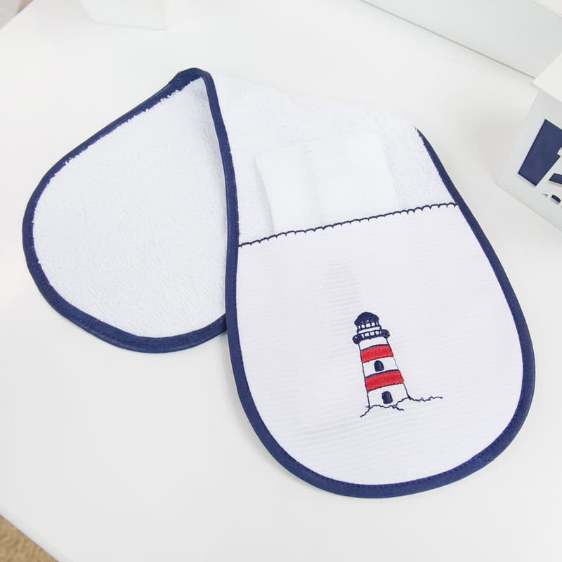 1 Regurgitador 46cm x 15cm 1 Fralda de Boca 34cm x 32cm Cor: Branco e Marinho Tecido: 100% Algodão