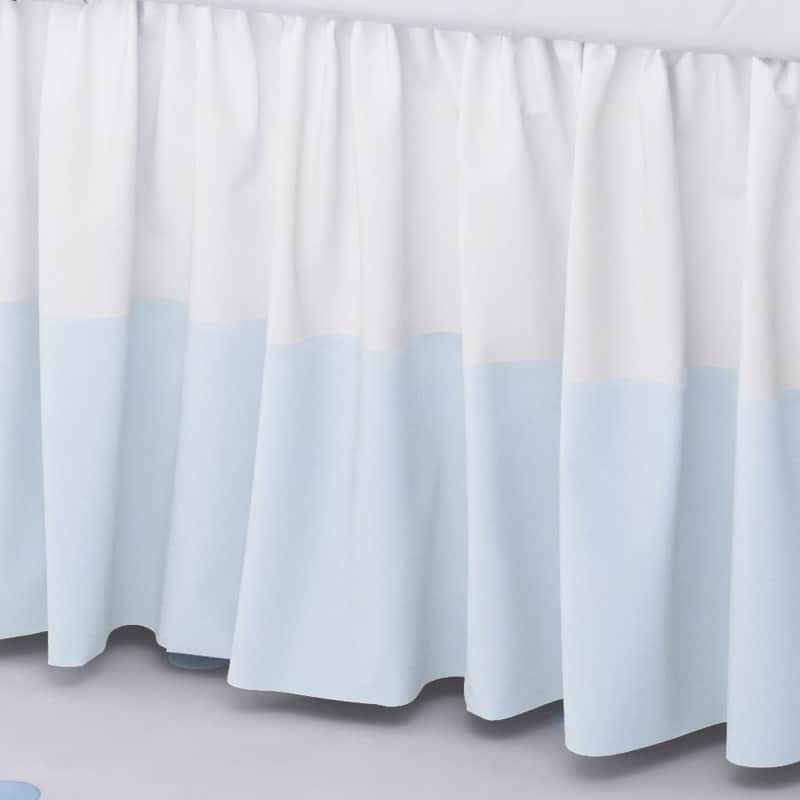 A ternura da maternidade nos serviu de inspiração para essa exclusiva Saia de Berço! Numa fina confecção, esse tecido de 1,35 metros de altura preenche o espaço abaixo do colchão e finaliza a decoração do quarto de bebê com o bom gosto da Grão de Gente. Esse modelo embeleza o ambiente com a suavidade do azul bebê, que aparece na barra de tecido branco - perfeito para agradar meninos e meninas. Para usá-lo, basta levantar o colchão e posicionar a saia sobre o estrado, deixando os babados caírem pelas laterais.