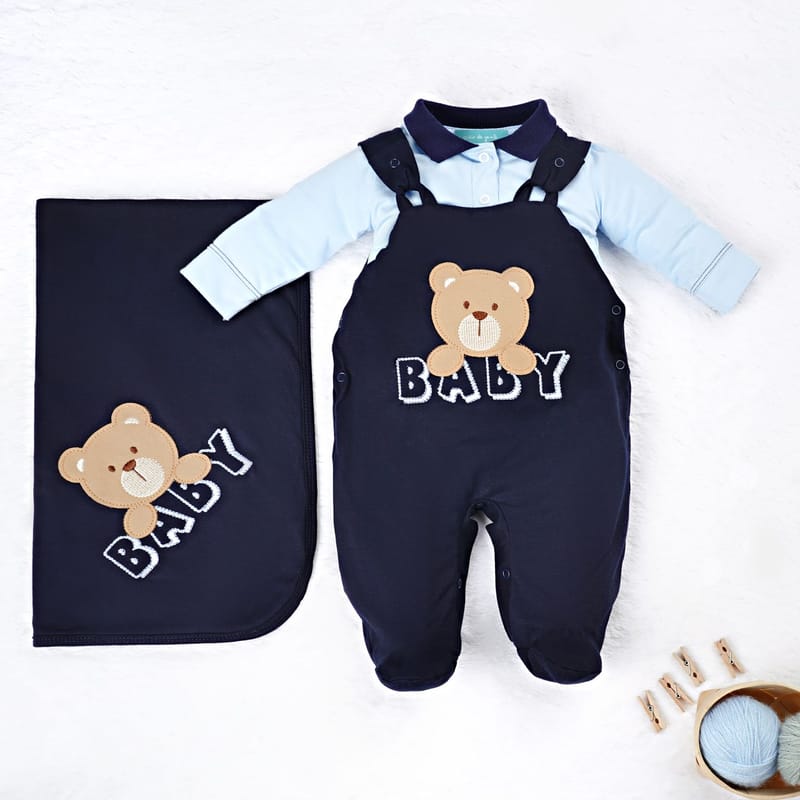 Saída Maternidade Jardineira Ursinho Baby Azul Marinho 03 Peças