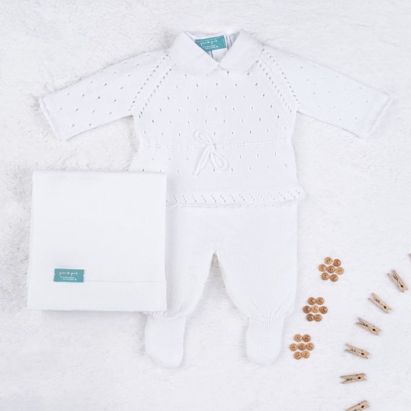 • Macacão de tricot com pontos furadinhos na parte superior, ajuste na cintura, pézinhos, abotoamento nas costas e no cós para facilitar as trocas de fraldas