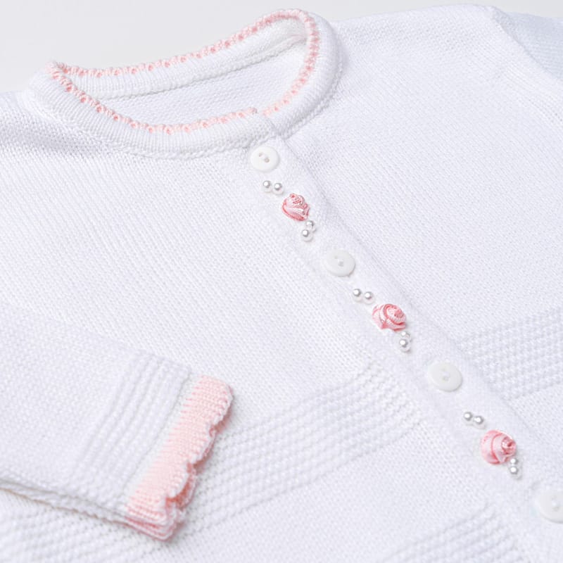 • Casaquinho branco com detalhes em cor-de-rosa, acabamento nos punhos e barra, abertura frontal, detalhes de mini pérolas e flores rococó bordadas