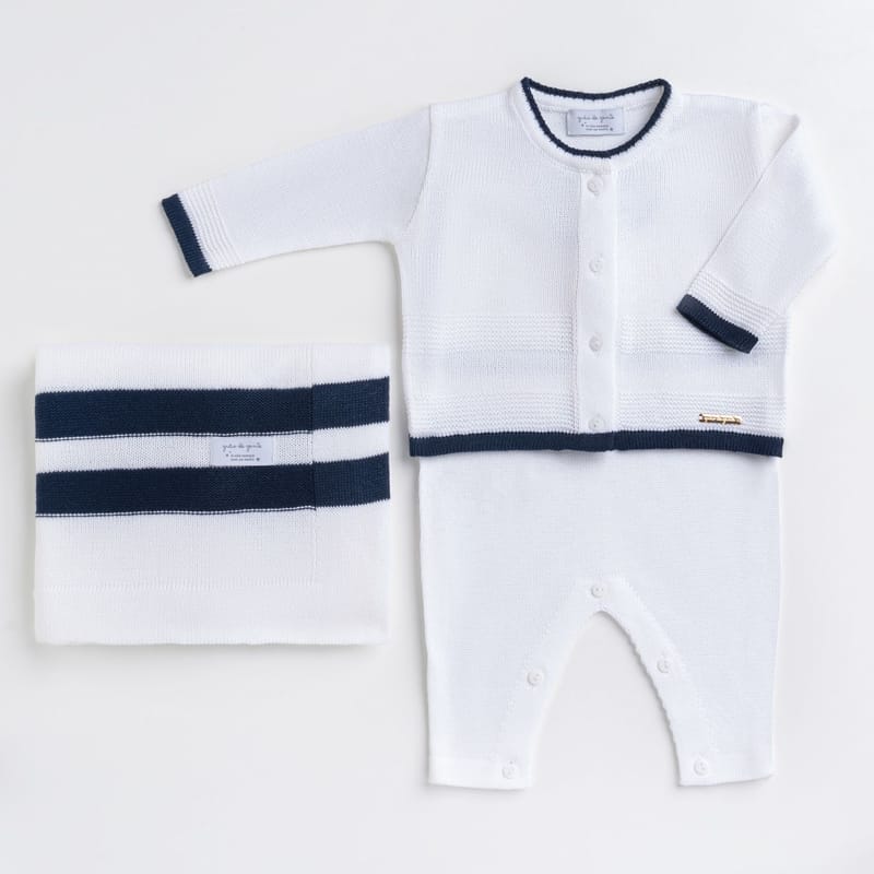 Saída Maternidade Tricot Macacão e Casaquinho Branco e Azul Marinho 03 Peças