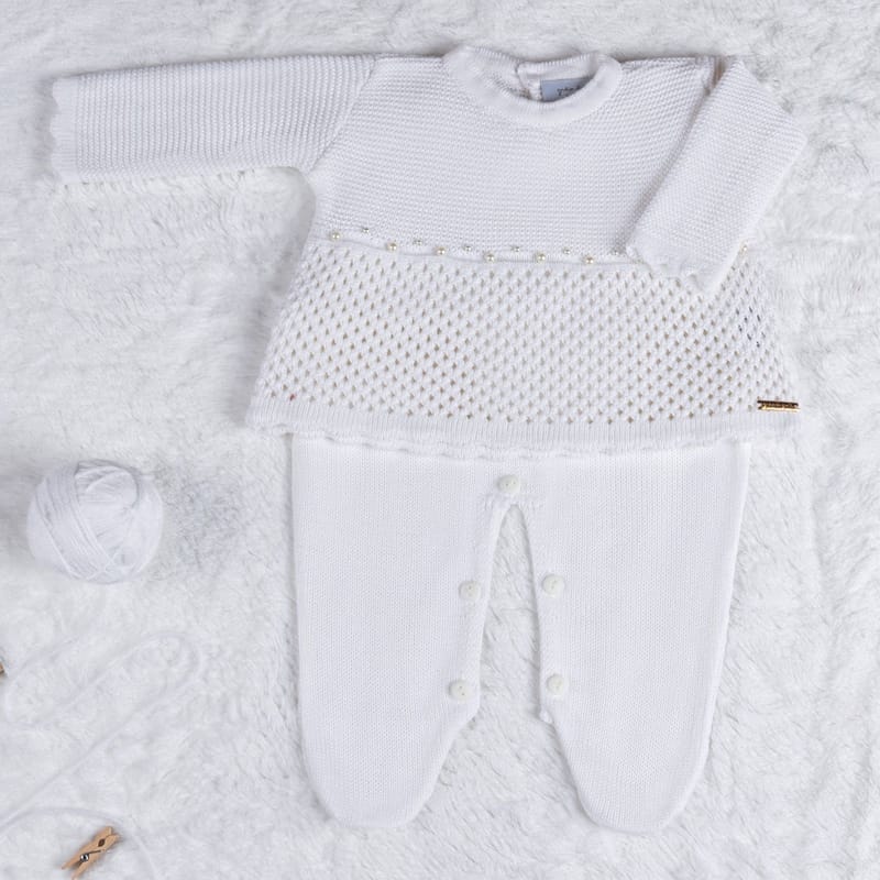 • Macacão branco sem manga, com pézinhos, abotoamento nos ombros e no cós para facilitar as trocas de fraldas.