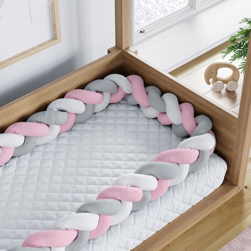 A Trança Lateral Para Mini Cama Branco Cinza e Rosa é uma criação exclusiva da Grão de Gente para complementar a decoração do quarto infantil com a atmosfera moderna do protetor trançado.