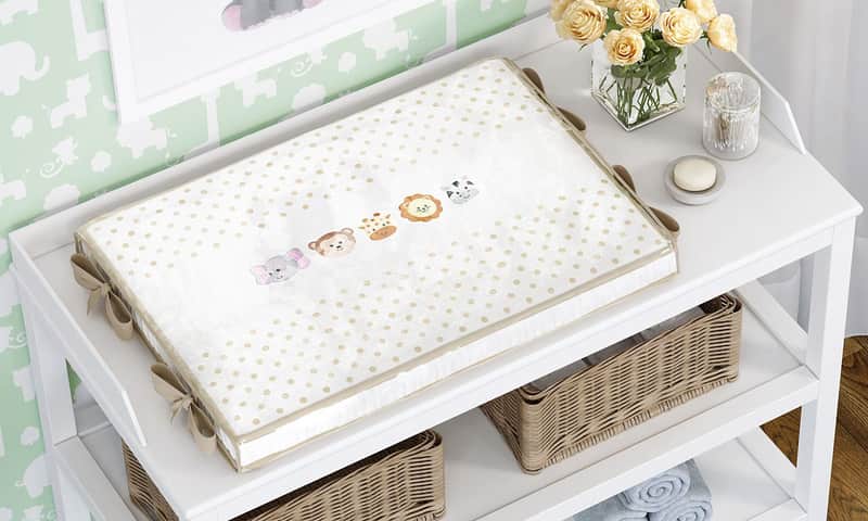 Trocadores para cômoda com espuma firme e capa impermeável removível. Práticos e higiênicos, facilitam a troca de fralda com segurança. Disponíveis em diversos temas para combinar com a decoração do quarto.