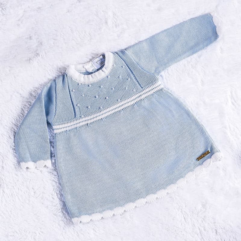 Esse vestidinho de tricot encanta a todos com seus detalhes românticos! Na parte superior, o ponto casinha de abelha bordado de pérolas, nos punhos e na barra, faixas brancas chamam a atenção. O fechamento desse modelinho é na parte de trás por botões. Um look charmoso e uma opção perfeita para presentear a recém-nascida.